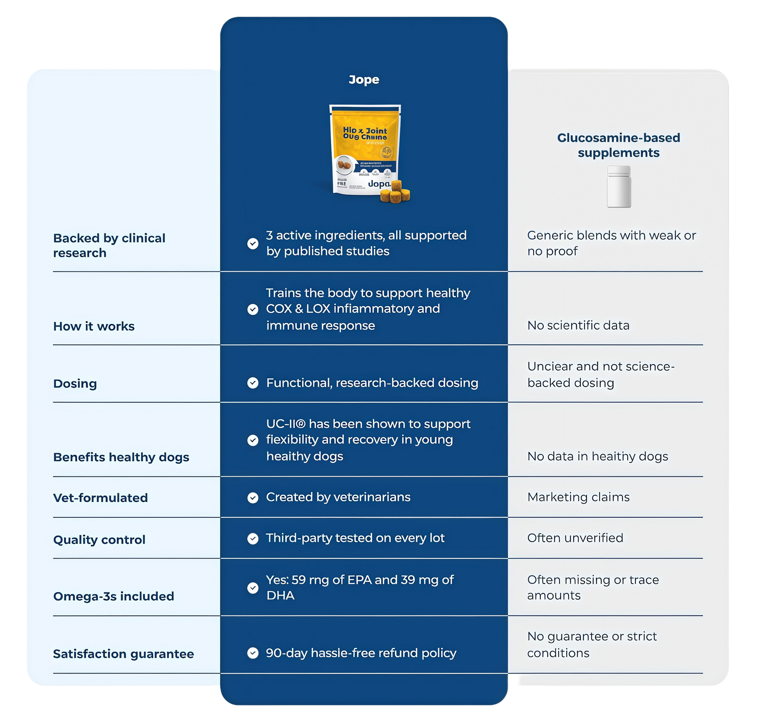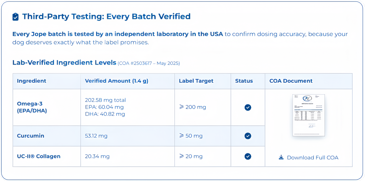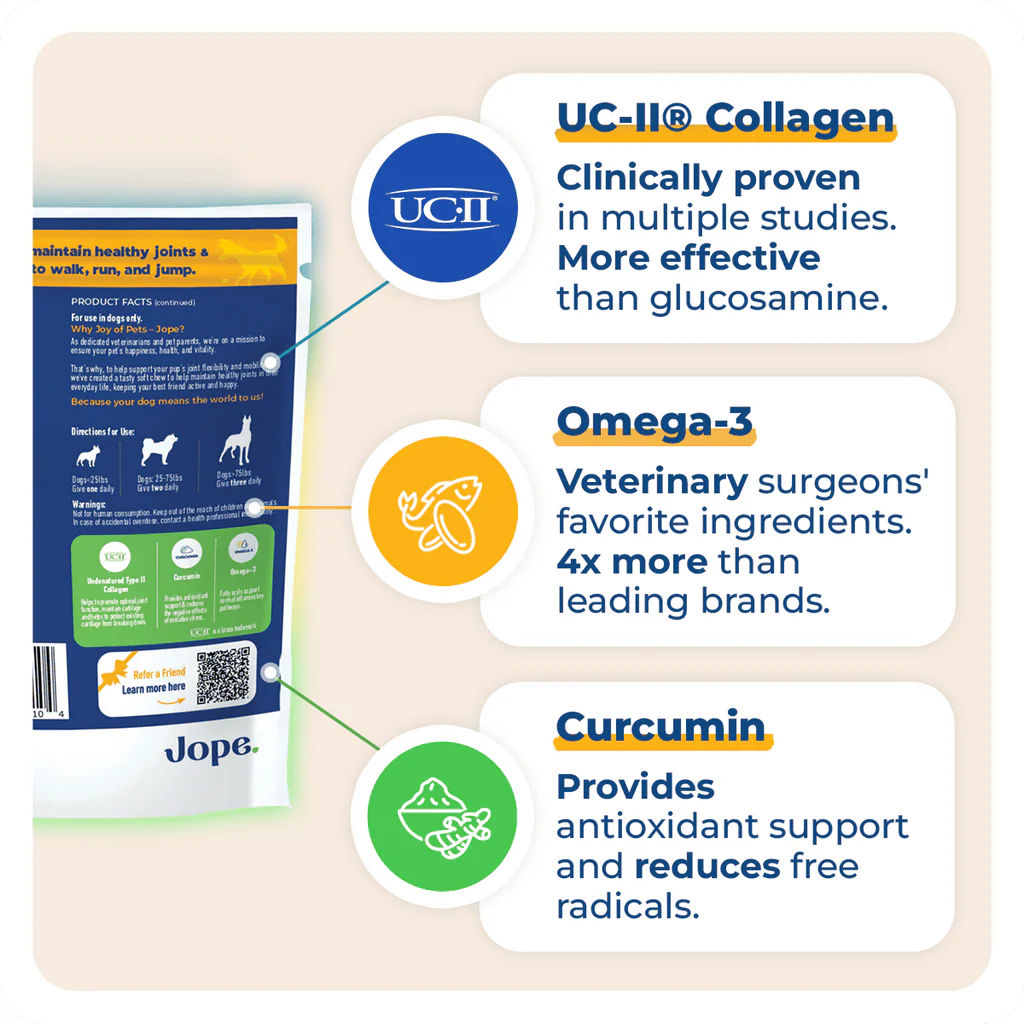 We mindfully formulated our Jope Hip & Joint chews using the most effective ingredients supported by over 85 studies. You can read more about them here: UC-II®, omega-3, and curcumin.